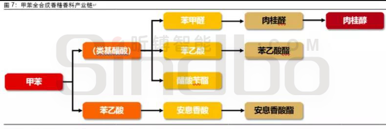 化学全合成香料主要以石油系、煤焦油系的原料为起点,通过化学工艺合成香料产品, 主要通过乙炔/丙酮、甲酚、异戊二烯、甲苯、苯、乙炔/丙酮和甲酚合成多种香料产品, 下文主要介绍异戊二烯、甲苯和苯合成香料的产业链。