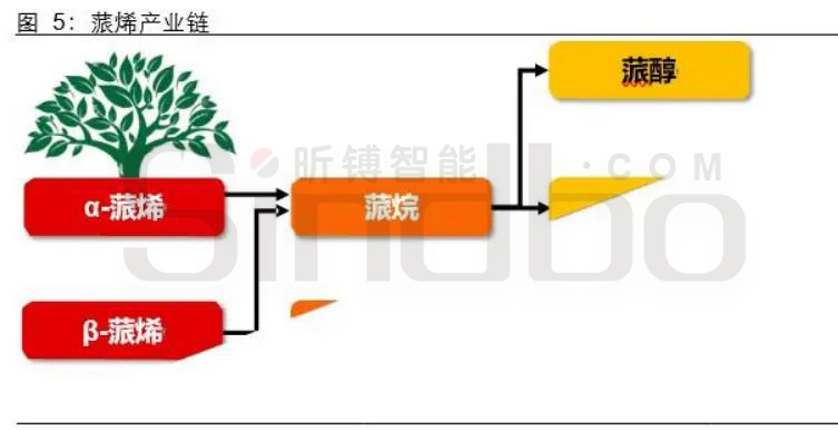 蒎烯:产业链下游需求集中于香叶醇和柠檬醛。蒎烯存在于天然松节油中,世界松节油年产量在 30 万吨左右,蒎烯主要有 α 型和 β 型两种异构体。全球蒎烯年生产量超过 9 万吨,主要用于合成芳樟醇、香叶醇、柠檬醛等多种大宗香精香料。由于天然松节油主要从松树松脂提取,自然产量受限,天然半合成市场供给仍趋紧。