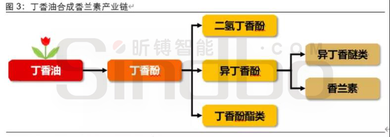 丁香油:合成大宗香料香兰素。丁香油(丁香茎提取物)提取天然丁香酚,利用丁香酚合成的香兰素质地接近于天然产品,受到高端食品饮料市场广泛青睐。但利用丁香油、木质素等原料生产香兰素过程会排放较多污染物,面临环保压力较大。丁香酚能合成二氢丁香酚、异丁香醚、香兰素和丁香酚酯类产品。